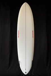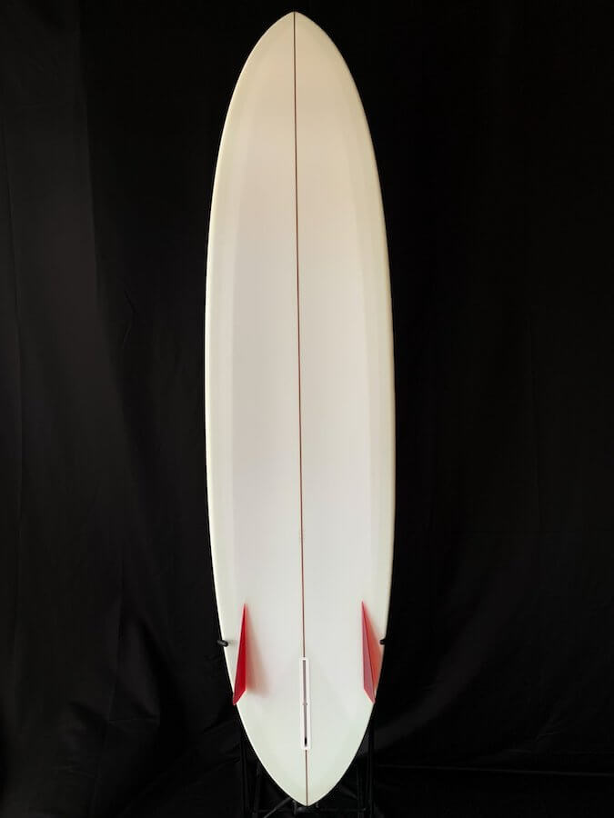”My favorite round pin template used as the nose and tail template to make an identical 50/50 outline. glider style 70/30 down rails, triplane bottom with deep double concave through the tail. Was going for a mini-glider kinda thing, with lots of hold and bite on the rail to handle steeper sections - have always liked more foiled out glider type boards, and this proved a good time to explore one. Vs. the v.bowls - Thick Lizzy rides high on the water's surface and planes out faster in lower-quality surf; can also be cheater-fived for miles. We've found it to be a good compliment to the v.bowls as a longer alternative with a different approach to rail line and foil distribution.”